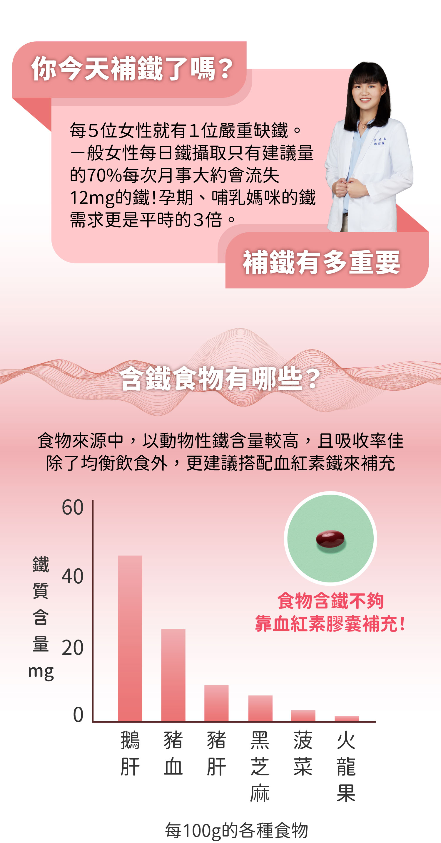 成份:血紅素(豬)300mg、大豆油、明膠、甘油、乾燥肝粉(豬)50mg、丁烯二酸亞鐵41mg、純水、蜜蠟、大豆卵磷脂、硫酸銅、食用紅色40號、硫酸錳、二氧化鈦、葉酸、維生素B12、食用黃色5號、食用藍色1號