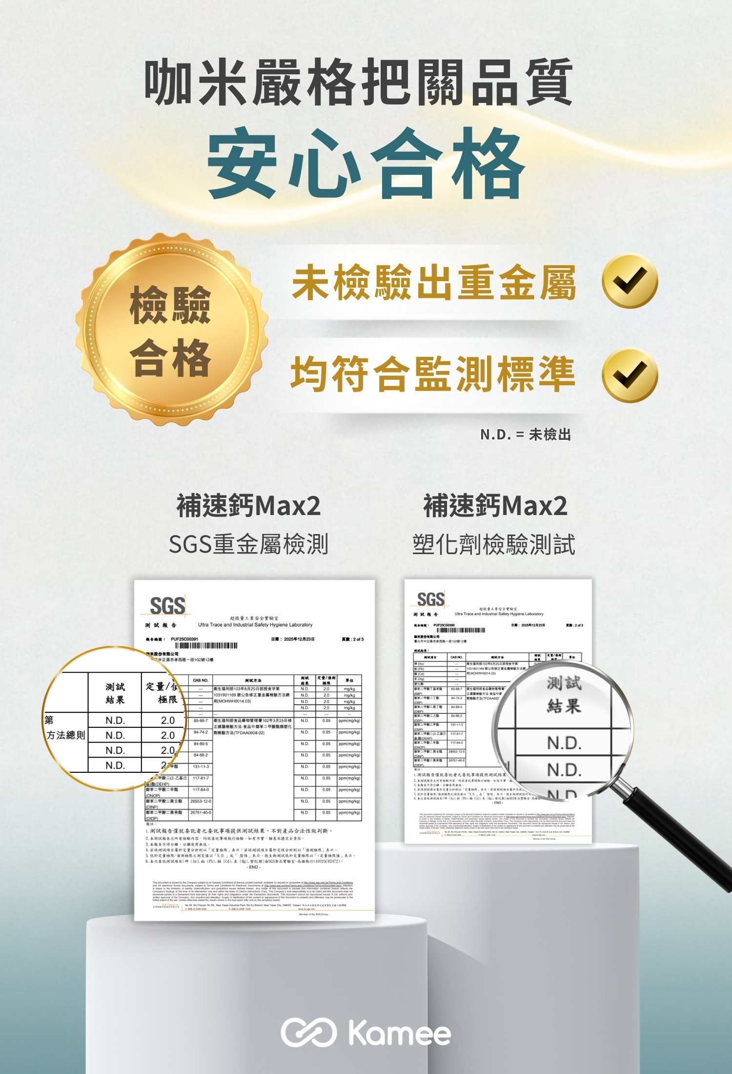 成份:每粒含胺基酸螯合鈣500mg、馬鈴薯澱粉、二氧化矽、硬脂酸鎂、鷹嘴豆發酵萃取粉15mg(阿拉伯膠、蔗糖、鷹嘴豆發酵萃取物(含維生素K2-7))、維生素D3 2mg(0.25%)(辛烯基丁二酸鈉澱粉、蔗糖、L-抗壞血酸鈉(抗氧化劑)、中鏈三酸甘油酯、二氧化矽、維生素E(抗氧化劑)、膽鈣化醇)
