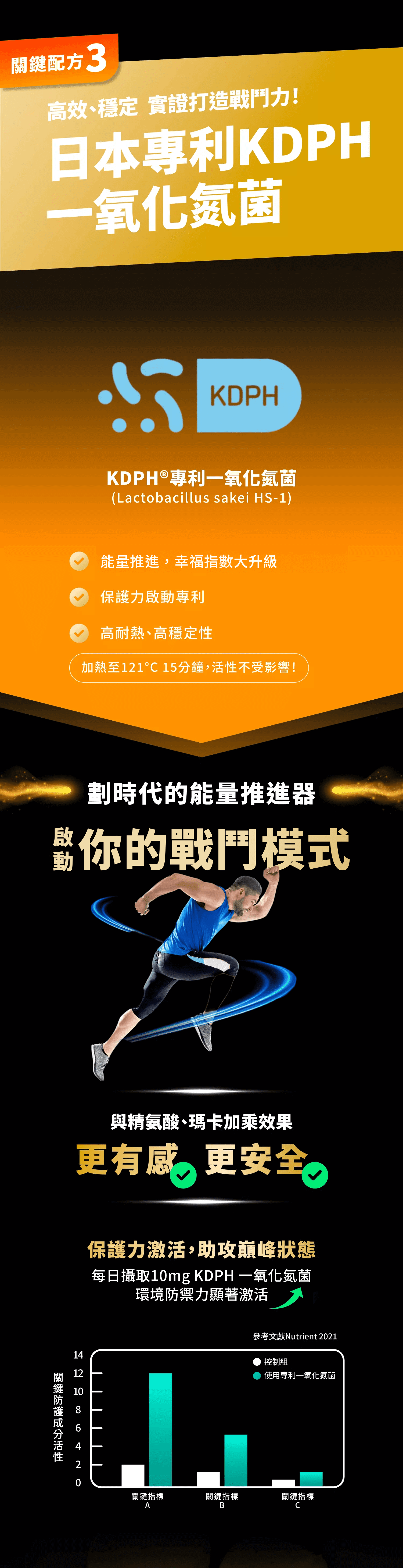 成份:瑪卡萃取粉(10倍濃縮400mg)、專利全食物型態精胺酸複方100mg(含酵母濃縮、柑橘濃縮、黃豌豆濃縮)、專利納透葉萃取粉50mg、KDPH®熱封清酒乳桿菌(一氧化氮菌)10mg、葡萄糖酸鋅25mg(鋅含量3mg)
