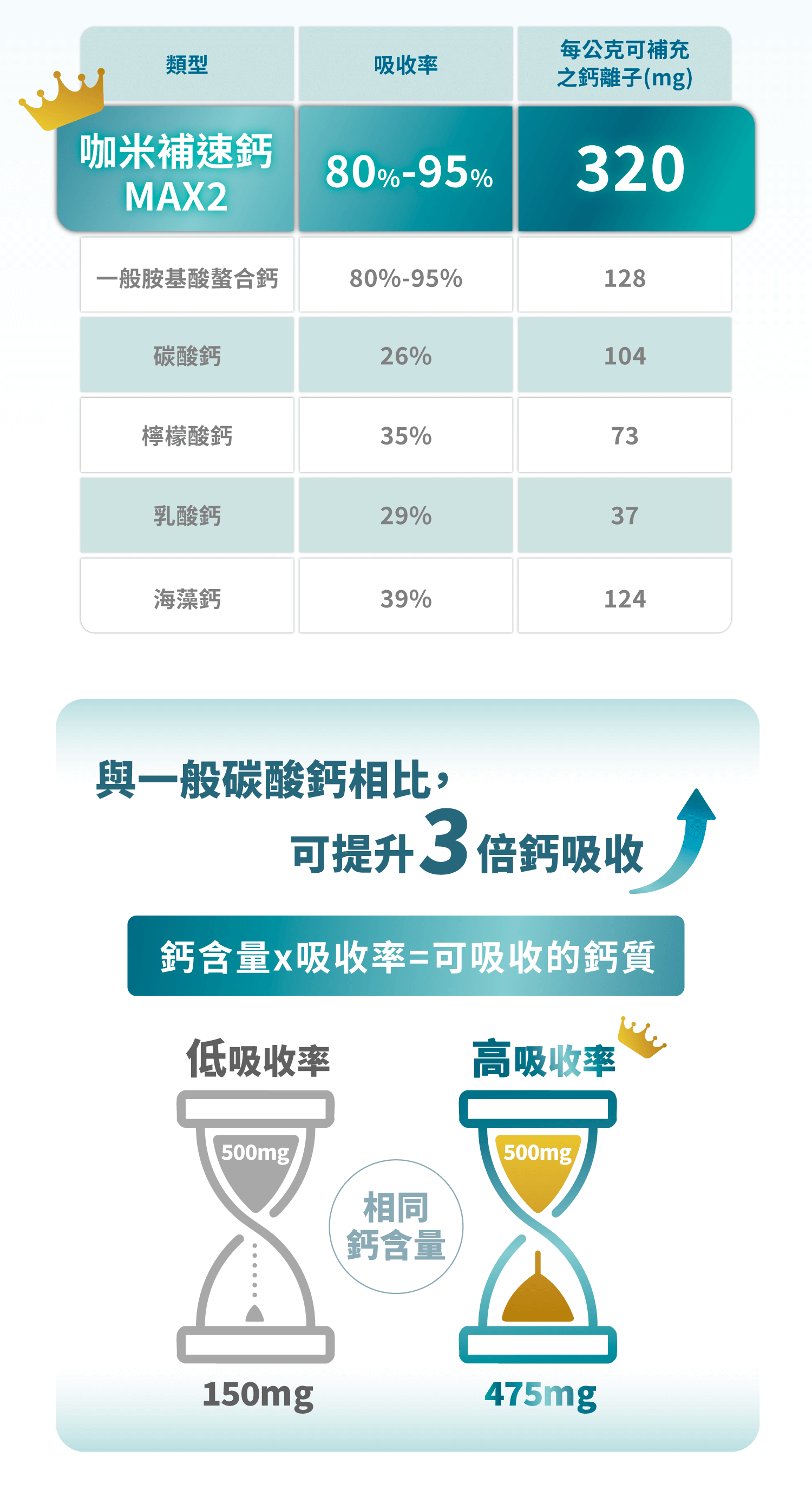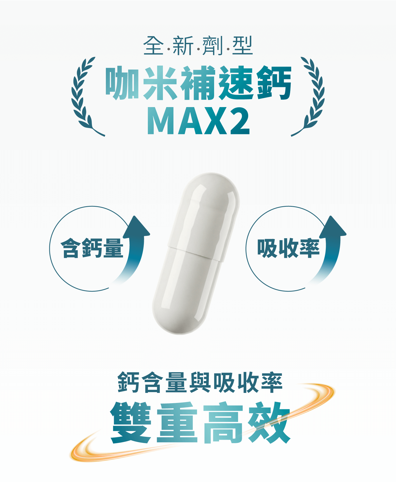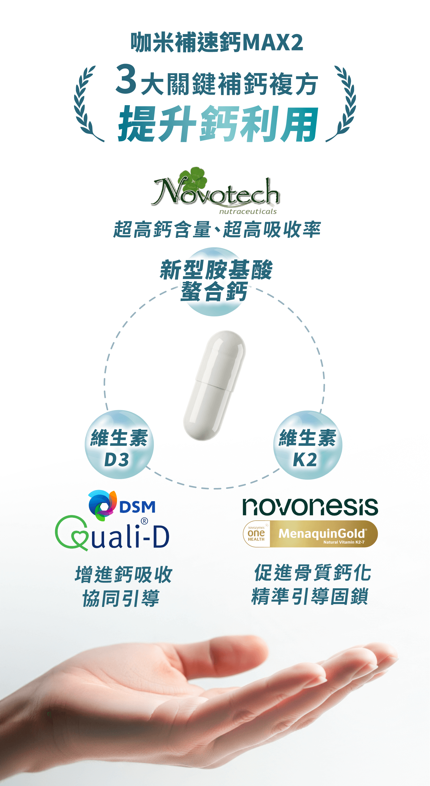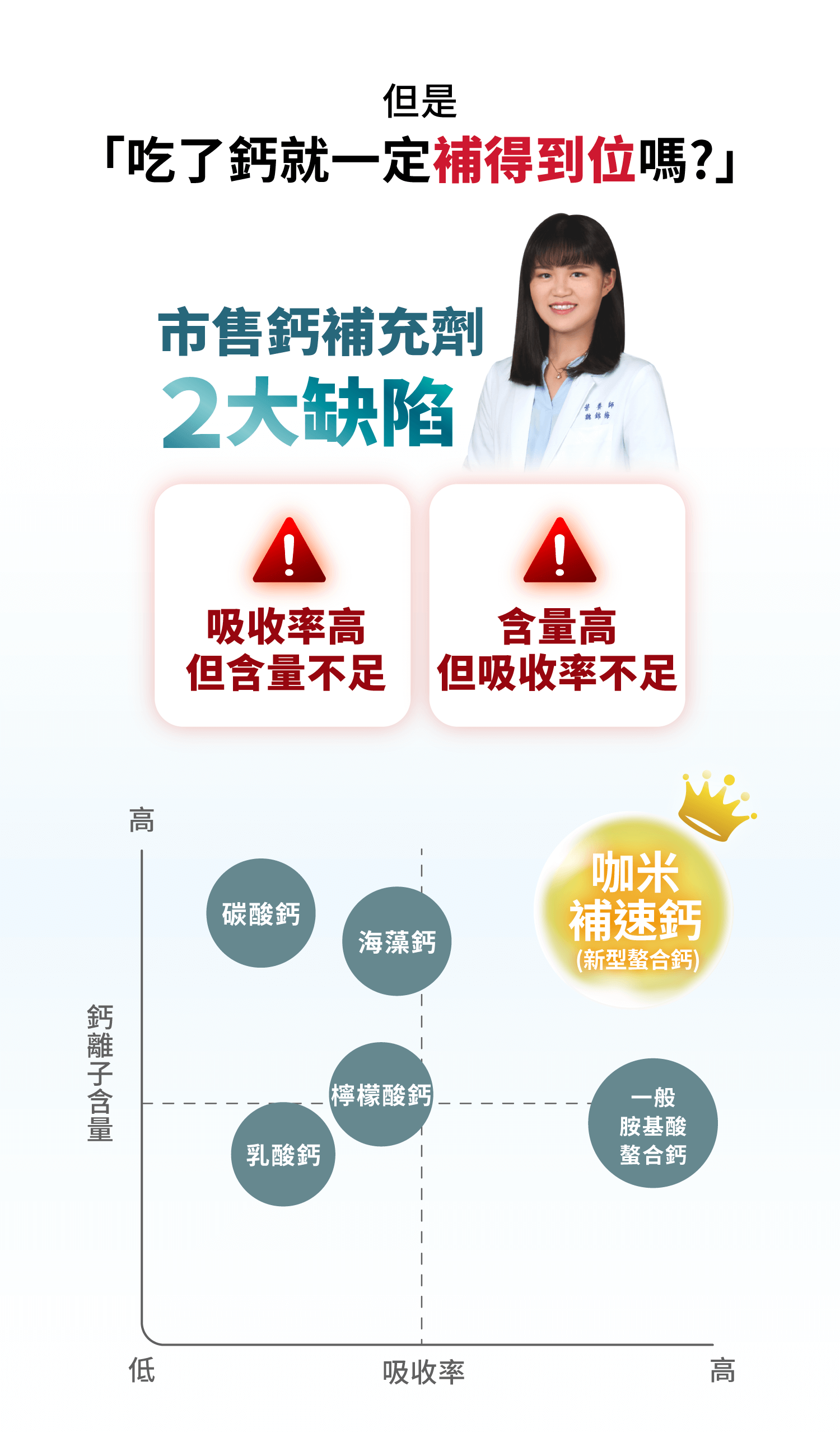 別擔心!咖米全新專利螯合劑型,小小一顆,鈣含量與吸收率都做到超高!