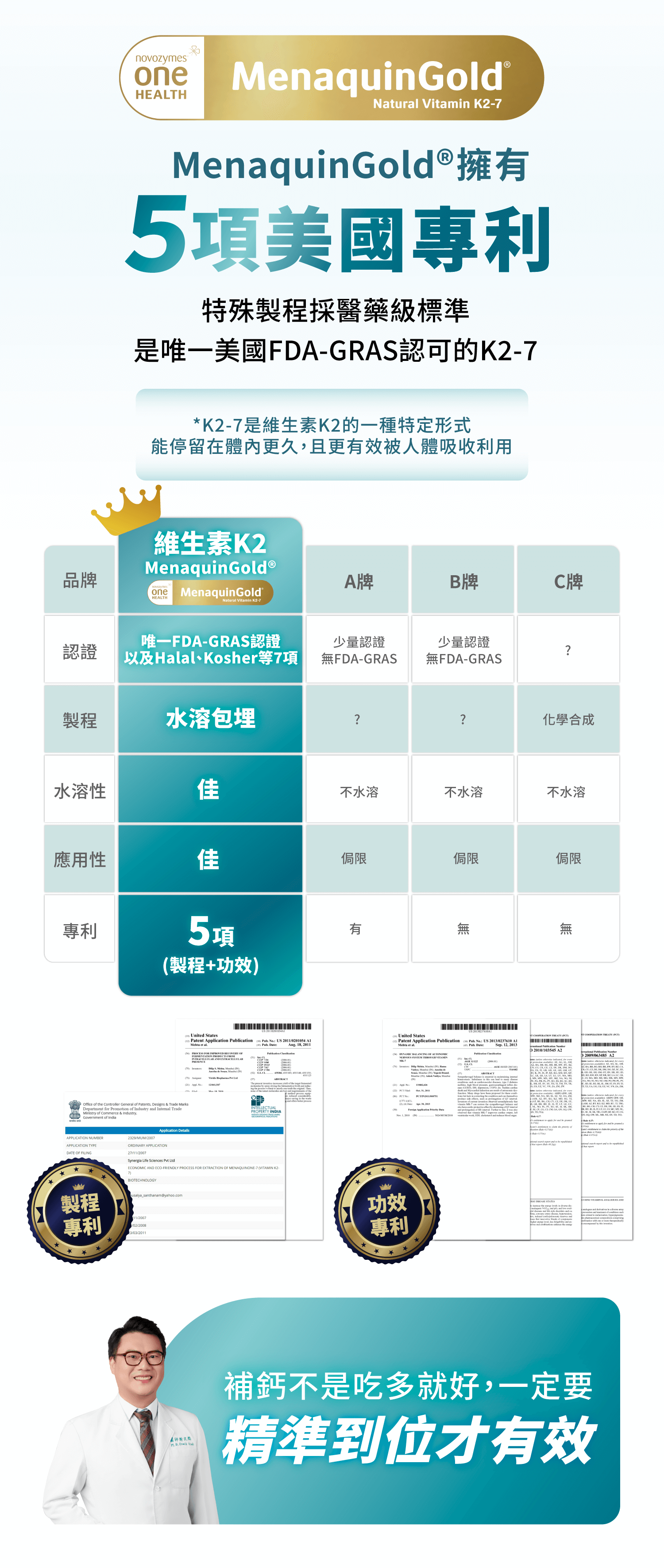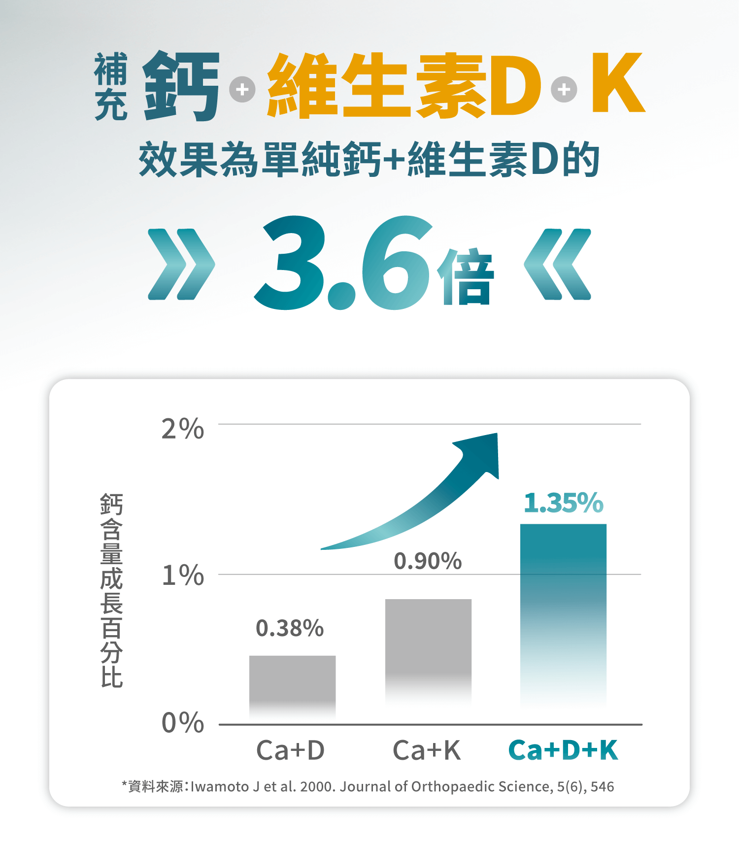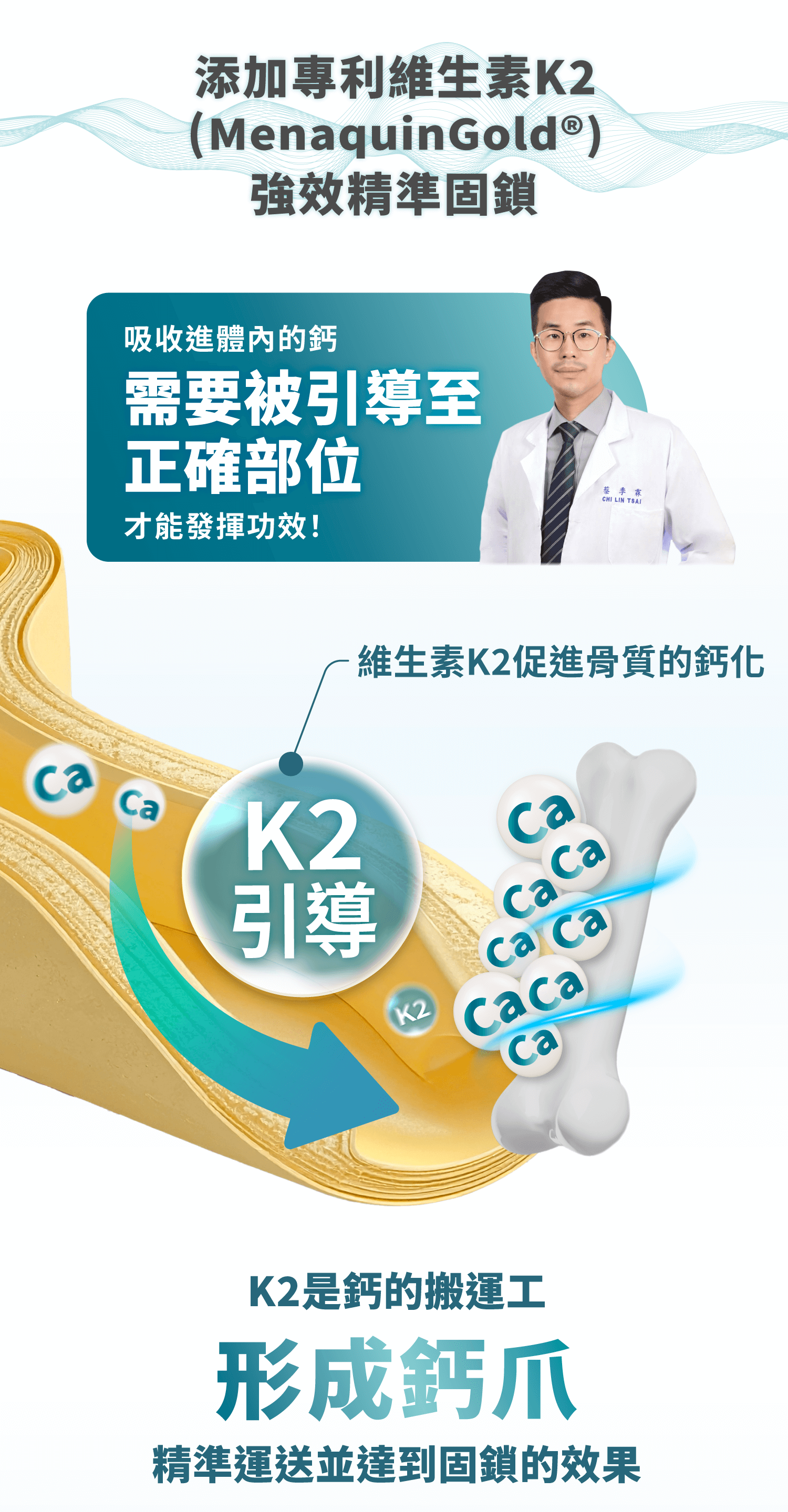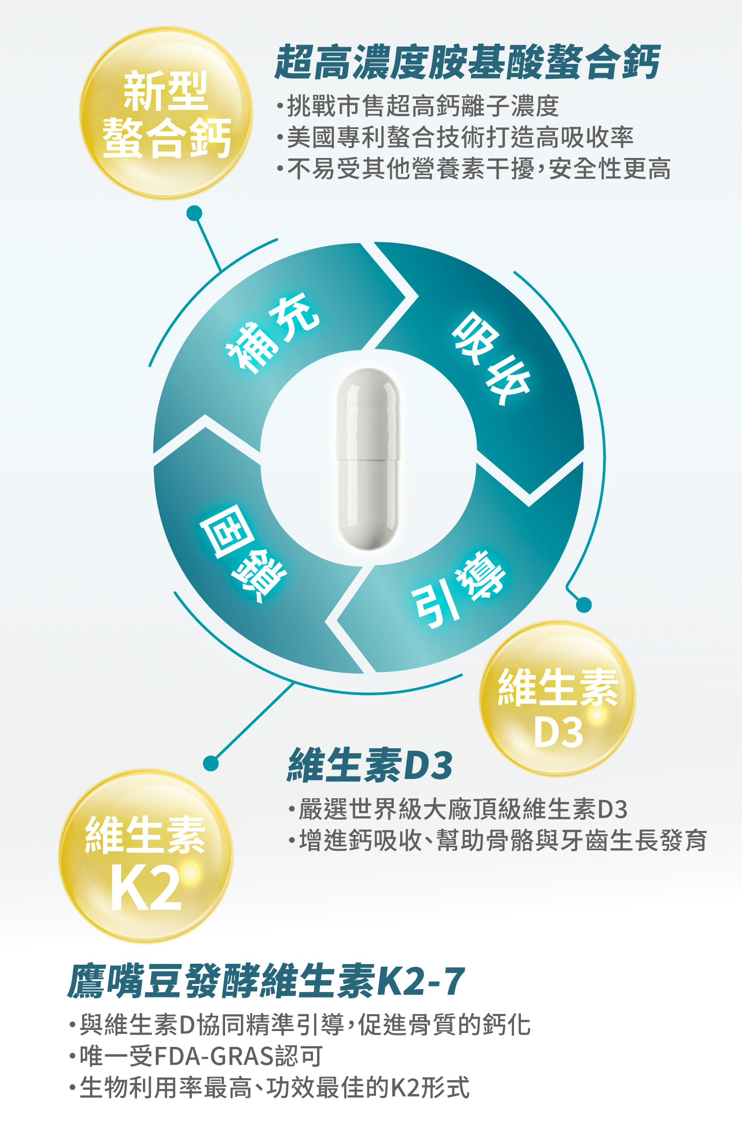 成份:每粒含胺基酸螯合鈣500mg、馬鈴薯澱粉、二氧化矽、硬脂酸鎂、鷹嘴豆發酵萃取粉15mg(阿拉伯膠、蔗糖、鷹嘴豆發酵萃取物(含維生素K2-7))、維生素D3 2mg(0.25%)(辛烯基丁二酸鈉澱粉、蔗糖、L-抗壞血酸鈉(抗氧化劑)、中鏈三酸甘油酯、二氧化矽、維生素E(抗氧化劑)、膽鈣化醇)