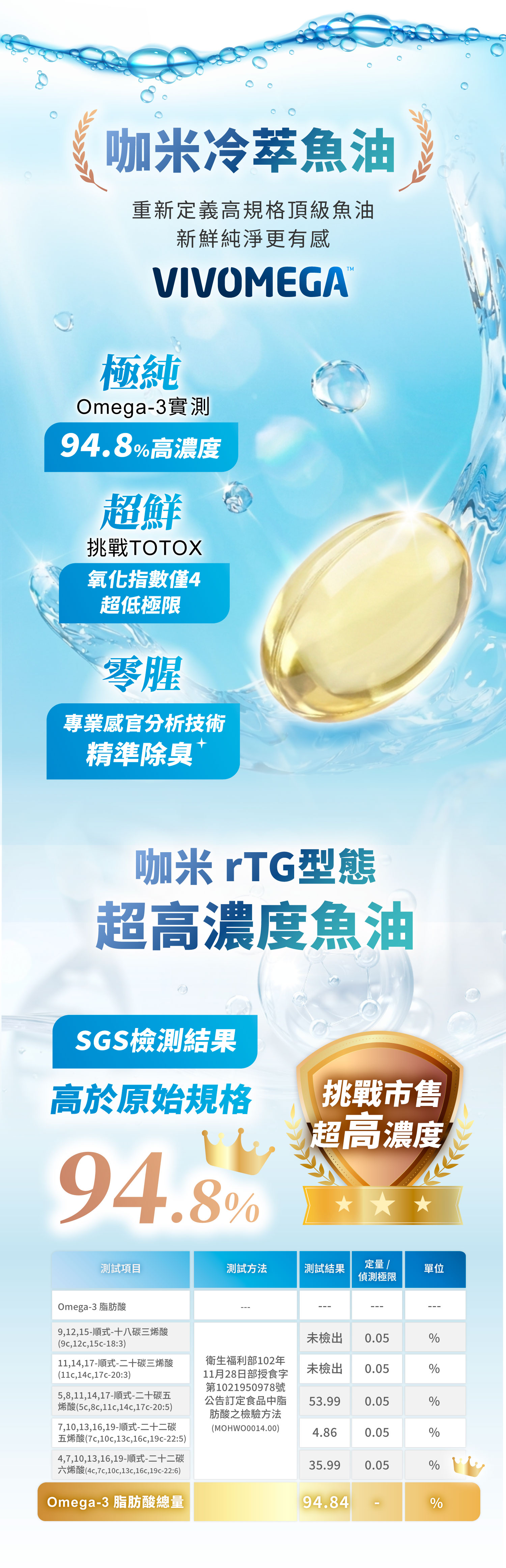 每份含948mg Omega-3,Omega-3濃度94.8%;EPA 540mg、DHA 360mg