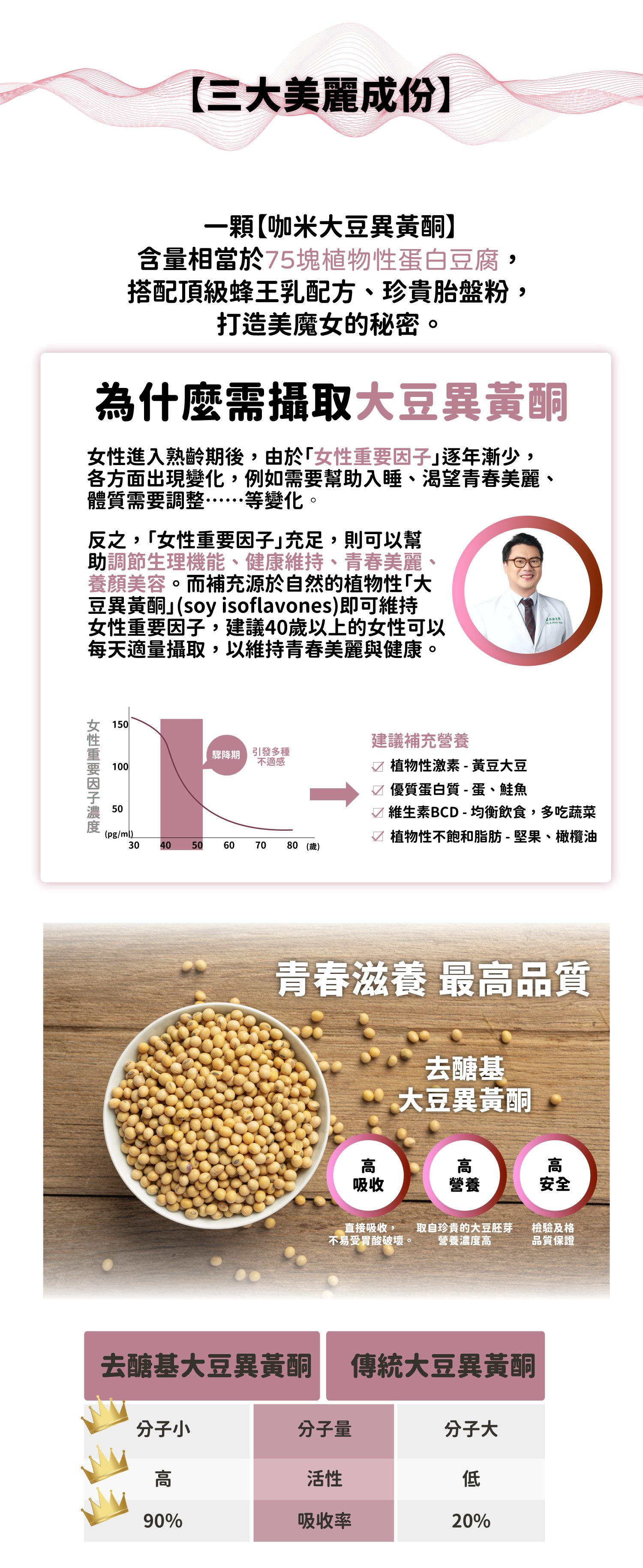 *注意事項:不建議兒童、少年、孕婦、哺乳期婦女、婦科腫瘤患者或有其家族病史者、氣喘患者食用,正在服用相關藥物者,服用前請先諮詢醫師;本產品含有大豆及其製品,不適合對其過敏體質者食用。