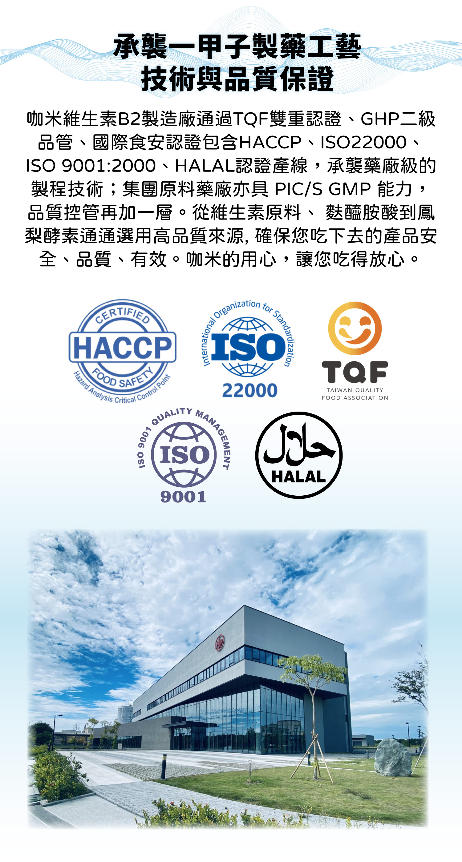 成份:核黃素(維生素B2)、麩醯胺酸、微結晶狀α-纖維素、鳳梨酵素(鳳梨酵素、葡萄糖)、D-山梨醇、羥丙基甲基纖維素、硬脂酸鎂、聚乙二醇99.99%(聚乙二醇、二丁基羥基甲苯(抗氧化劑))、二氧化鈦、二氧化矽、食用黃色四號鋁麗基、食用黃色五號鋁麗基
